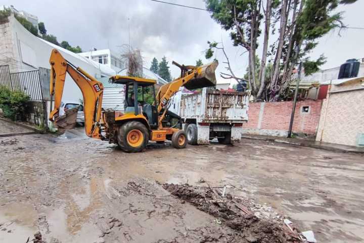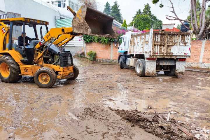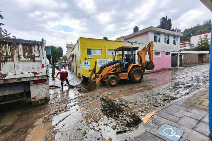 En la avenida Politécnico Nacional, en San Diego Metepec, maquinaria pesada retiró lodo de esta vía, mientras que policías municipales brindaron apoyo a conductores varados mediante maniobras de remolque en la colonia Adolfo López Mateos.