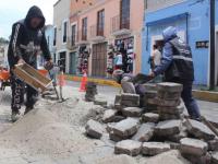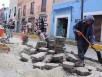 Como parte de estas labores integrales, en la calle Zitlalpopócatl, en la colonia Centro, se llevó a cabo la nivelación de adoquines, atendiendo una demanda ciudadana de esta zona de la capital.